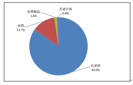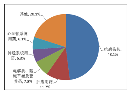 按照藥品類別統(tǒng)計(jì),化學(xué)藥品占86.6%,中藥占12.6%,生物制品占0.8%。化學(xué)藥品排名居前的藥品類別是抗感染藥、心血管系統(tǒng)用藥、腫瘤用藥、神經(jīng)系統(tǒng)用藥、電解質(zhì)、酸堿平衡及營(yíng)養(yǎng)藥;中藥排名居前的藥品類別是理血?jiǎng)⒀a(bǔ)益劑、祛濕劑、開竅劑、清熱劑。